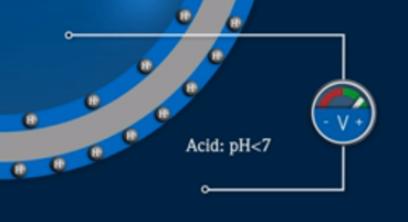 當探針浸入溶液中時,較小的氫離子能夠穿透玻璃膜的邊界區域,較大的氯離子保留在溶液本身中。因此,結果是電荷分離,如下圖所示: